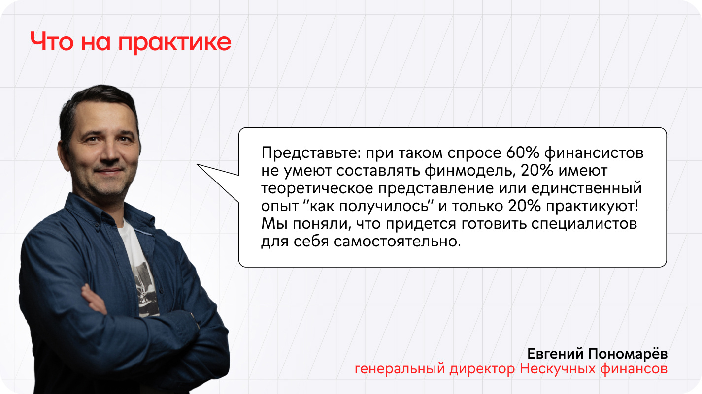 Занявшись идеей подготовки специалистов по финмодели, в Нескучных сначала хотели воспользоваться опытом ВУЗов и других курсов, которые уже были на рынке. Но, как оказалось, там не часто преподают практикующие эксперты.
