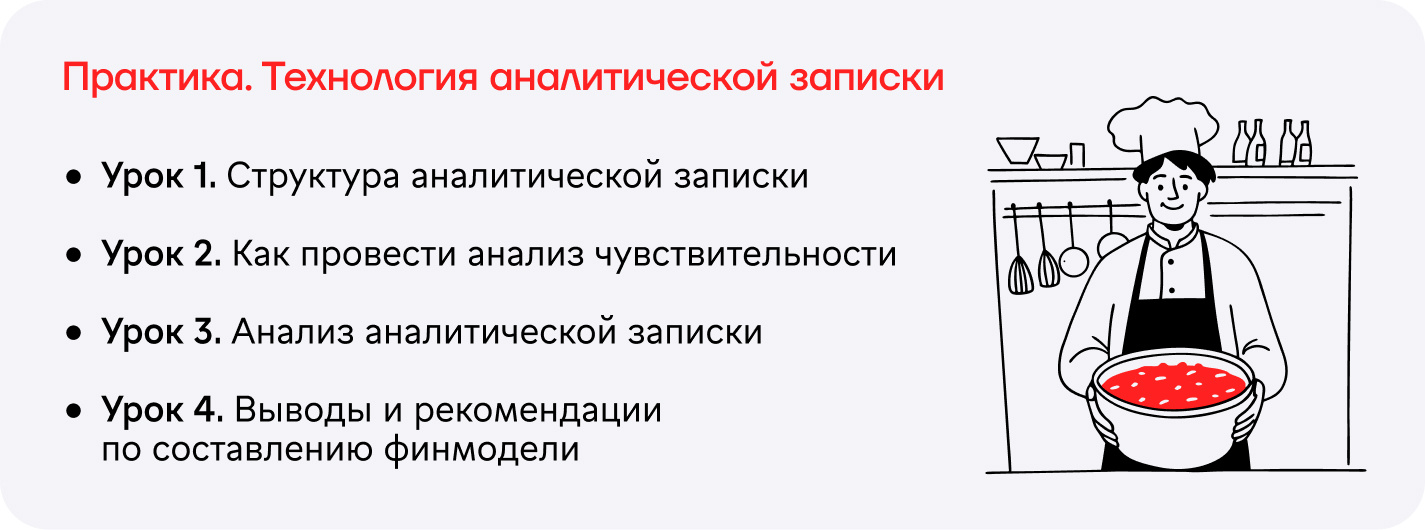 5 модуль — составление аналитической записки на основе финмодели. Вот, что нужно руководителям! Не цифры, а то, что можно из них создать — выводы, возможные решения, прогнозы.