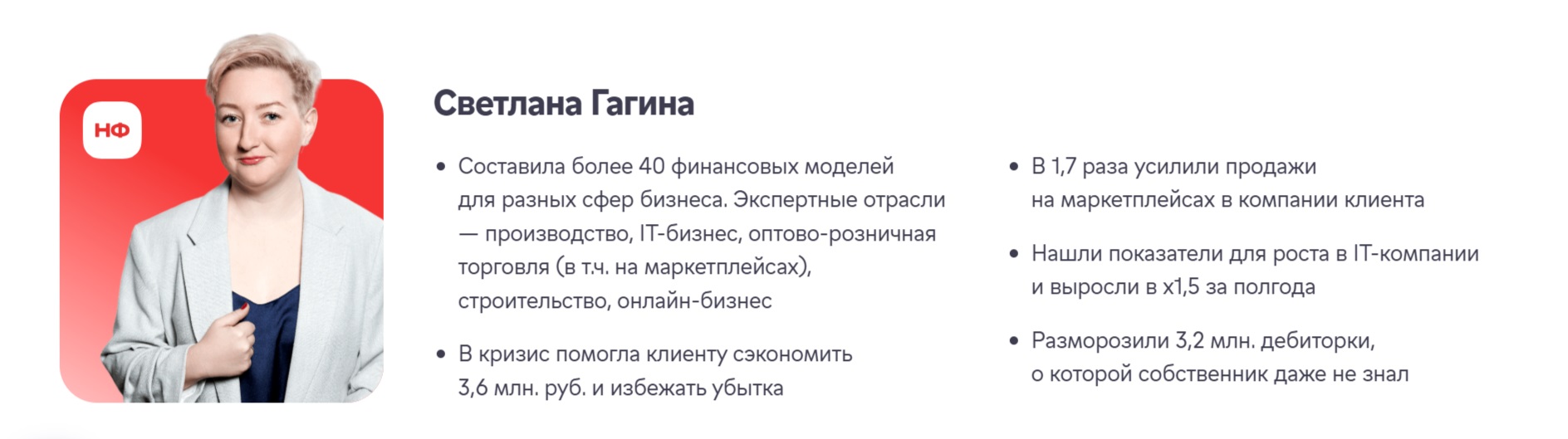 История вторая. Участница курса Инна после учёбы приняла решение присоединиться к команде финансовых директоров Нескучных финансов. «Мне понравилось, как вы просто и профессионально работаете, понравилась атмосфера в НФ. Светлана Гагина была доброжелательной, профессиональной, позитивной, показывала, какие чудеса можно творить, если владеешь финансовой моделью. И мне так захотелось к вам в команду. Когда увольнялась с прежней работы, составила финмодель. Чудес там не было, но руководитель всё равно впечатлилась. Было приятно», — отмечает Светлана.