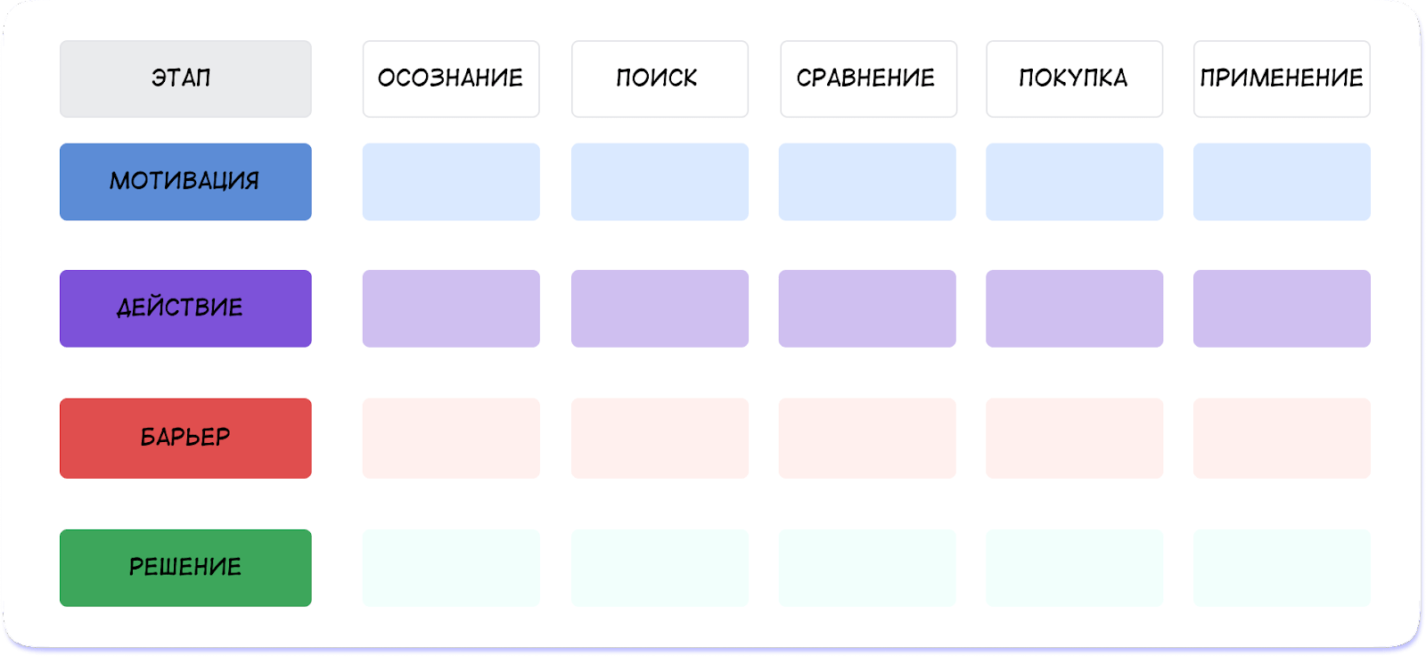 На основе ответов и этапов из предыдущей главы можно визуализировать карту пути клиента по схеме, используя шаблон CJM: