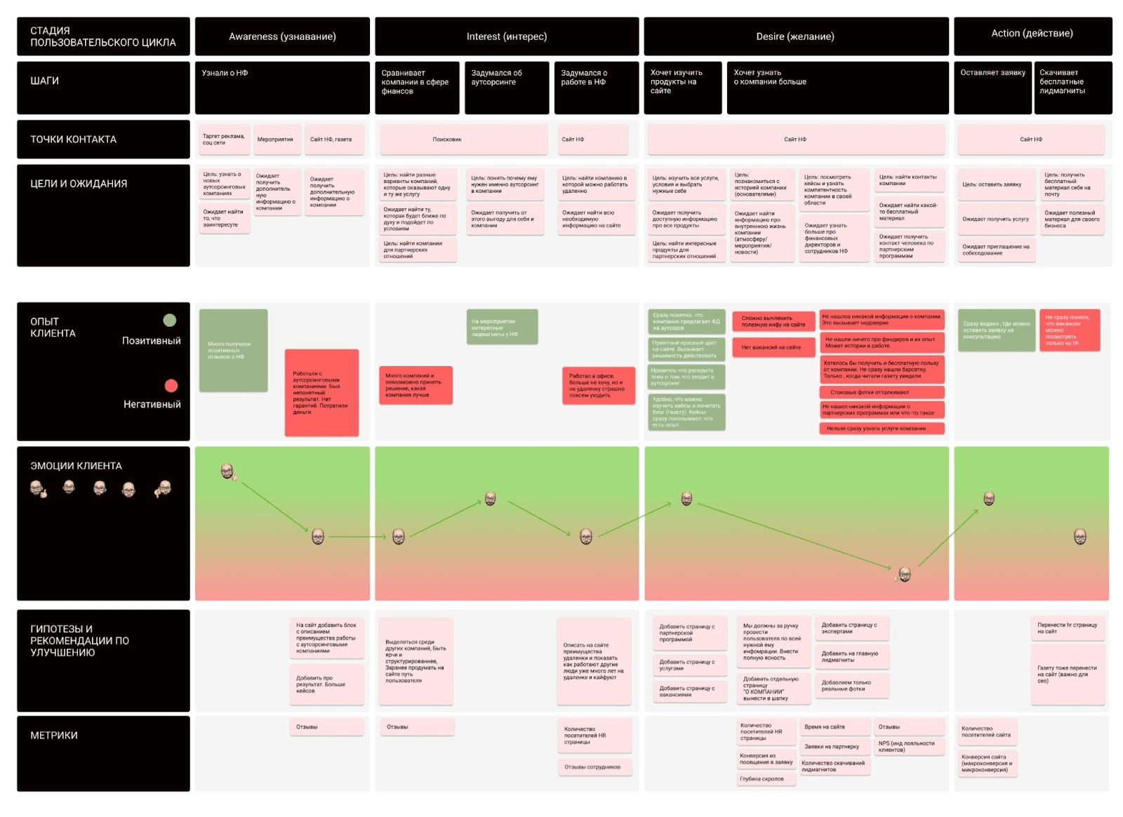 Пример карты пути клиента включает в себя всё: шаги клиента, его ожидания, цели, эмоции, наши гипотезы, метрики и всё остальное