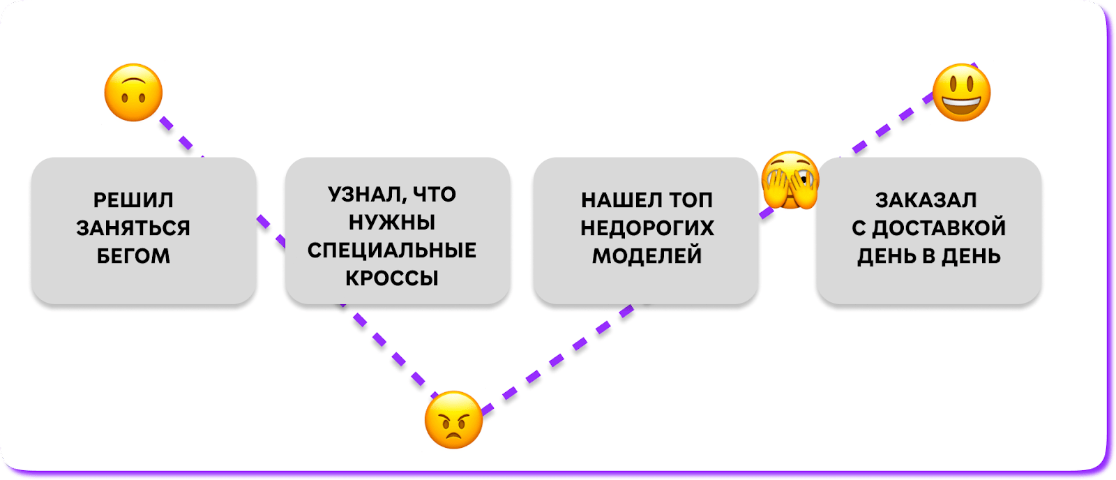 CJM же — это путь, на котором обязательно отмечают, что чувствовал человек на каждом этапе. Обычно это позитивные, негативные или нейтральные эмоции.