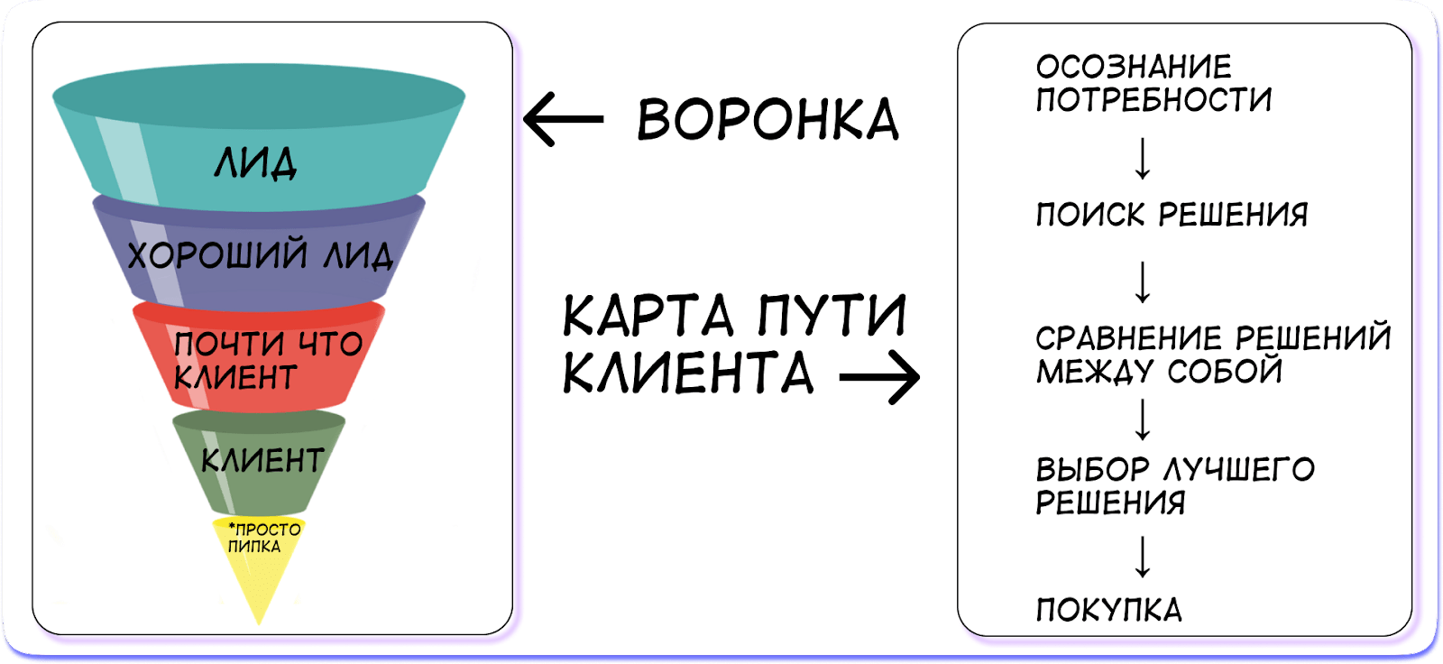 Воронка продаж составляется от лица компании, а карта пути — от лица клиента