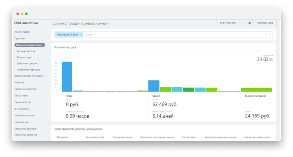 Главное преимущество CRM над любой таблицей в Экселе или Гугле — в том, что она дает сквозную аналитику продаж. Система содержит продвинутый блок аналитики в сфере продаж для принятия эффективных управленческих решений. В CRM видно, сколько за месяц поступило заявок, из какого канала они пришли — с сайта, из соцсетей или из рассылки. Еще видно, сколько заявок дошло до закрытия сделки и благодаря какому сотруднику.