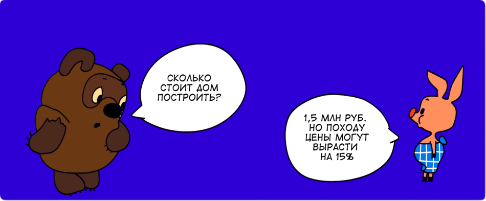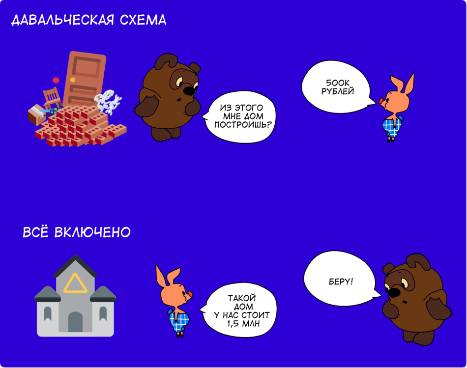 И вот в первом случае, с давальческой схемой, скачущие цены на материалы — проблема клиента, а не компании. Заказчик сам покупает брус и бетон, сам отслеживает цены и несет риски, связанные с изменением цены.