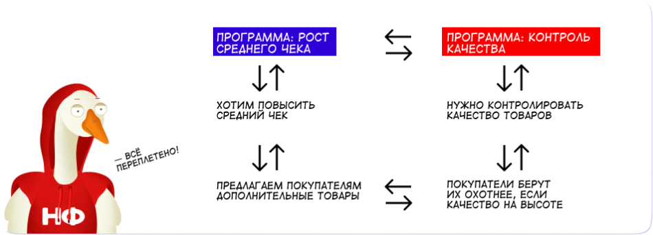 Например, если компания хочет повысить средний чек и занимается этим, то еще важно, чтобы в магазины поступали только качественные товары: рост среднего чека и контроль качества — это две связанные друг с другом программы развития.
