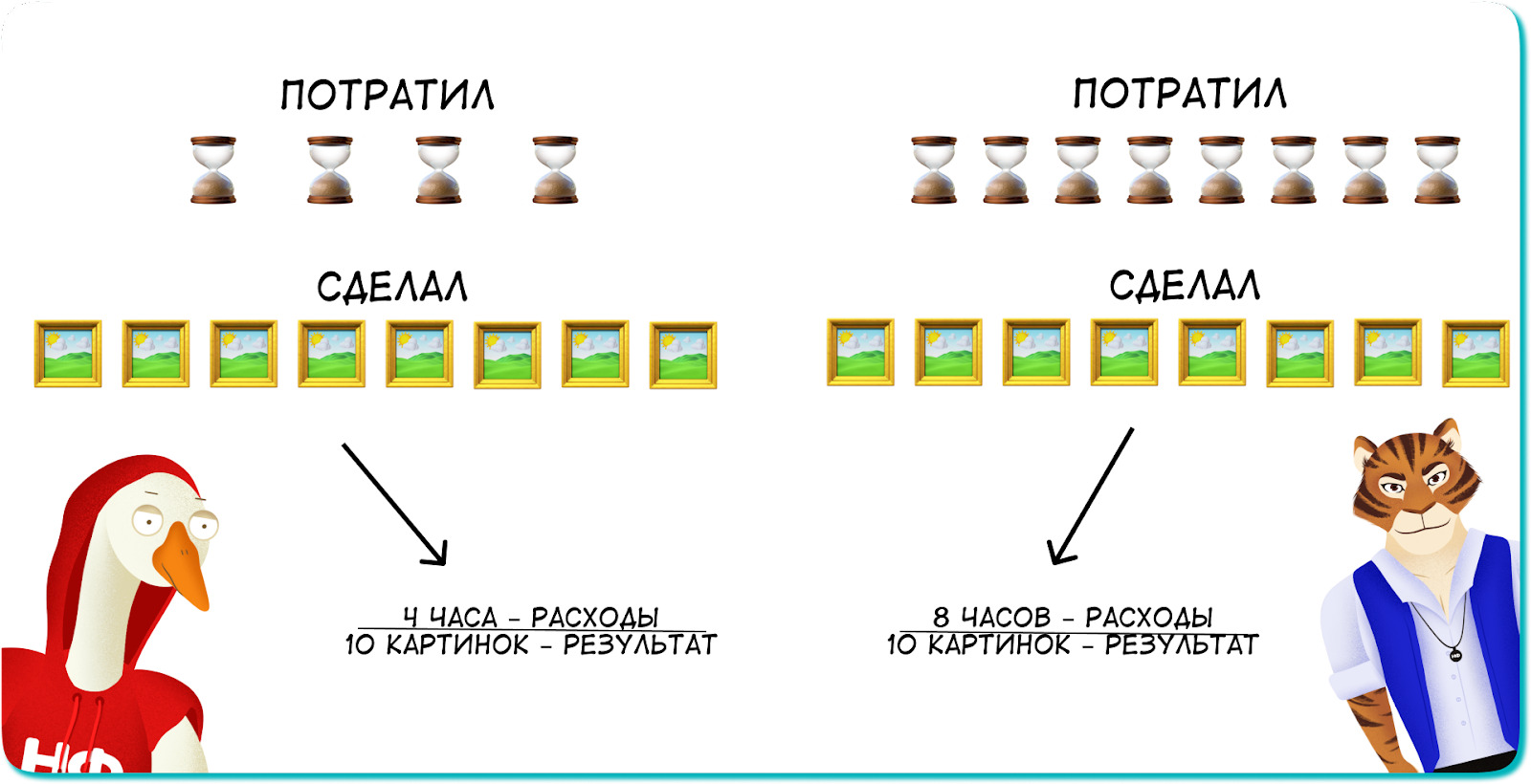 Другой пример. Возьмем за расходы не деньги, а время. Представим, что гусь и тигр решили стали дизайнерами. Гусь тратит на работу 4 часа и успевает за это время сделать 8 картинок, а тигру на то же количество картинок требуется 8 часов. Если считать, кто из них больше работает по часам, выиграет тигр. Но если смотреть на эффективность работы, гусь окажется впереди ↓
