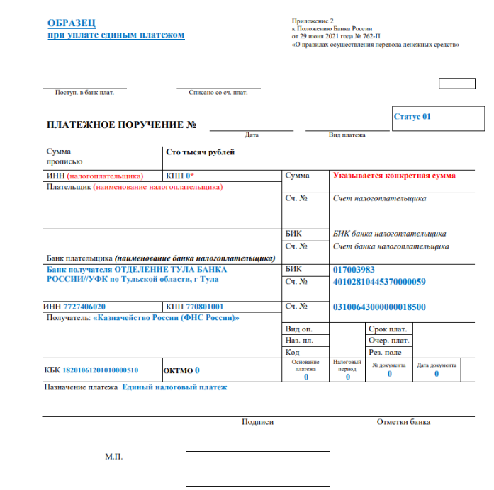 Образец платежного поручения, предложенный ФНС