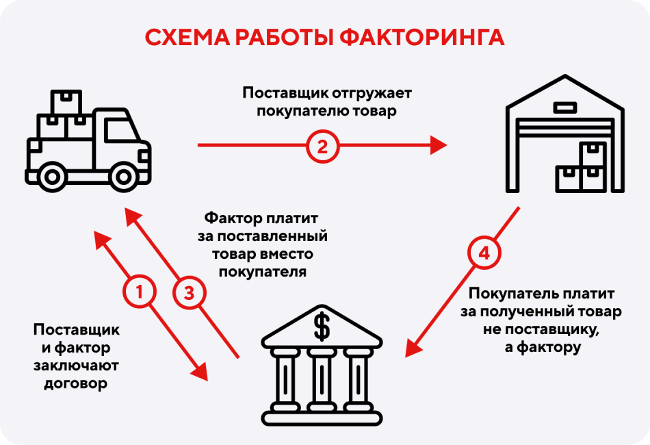 Продавец заключает с фактором договор. По нему фактор переводит деньги продавцу за проданные товары, работы или услуги почти полностью — до 90% платежа. Когда позже покупатель рассчитывается за покупку, деньги получает фактор. Он переводит продавцу остаток платежа и удерживает комиссию за свои услуги.