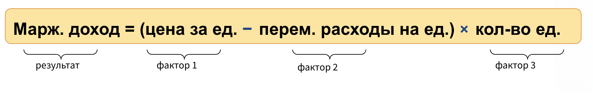 Смешанные модели используют все вышеперечисленные знаки: плюс, минус, деление и умножение. Формула получается более сложной. К примеру, маржинальный доход вычисляется так: