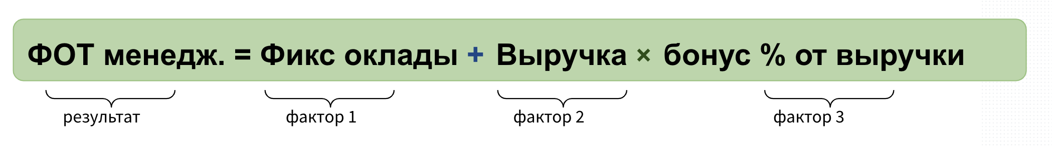 В зависимости от задачи можно использовать разные виды факторной модели, а значит, и разные формулы. Посмотрим на примерах.