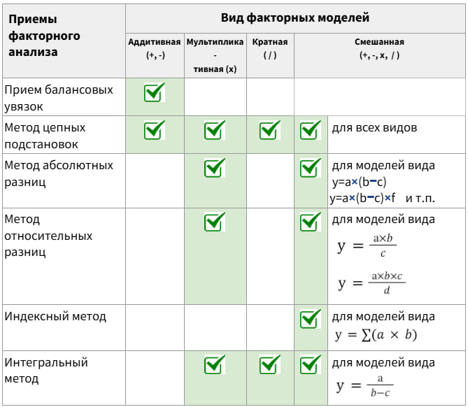 Выделяют четыре вида детерминированных факторных моделей. Все они укладываются в формулы с определенными математическими знаками:
