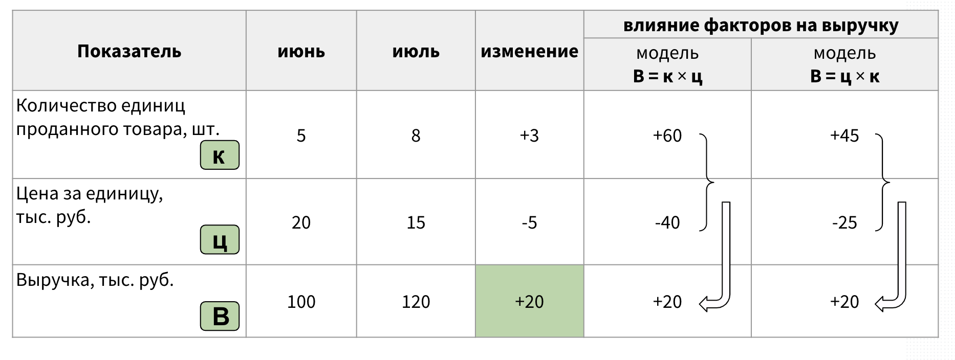 результат — выручку (В), два фактора: количество проданных единиц товара (К) и цену за единицу товара (Ц). Фактически есть только два варианта формул: