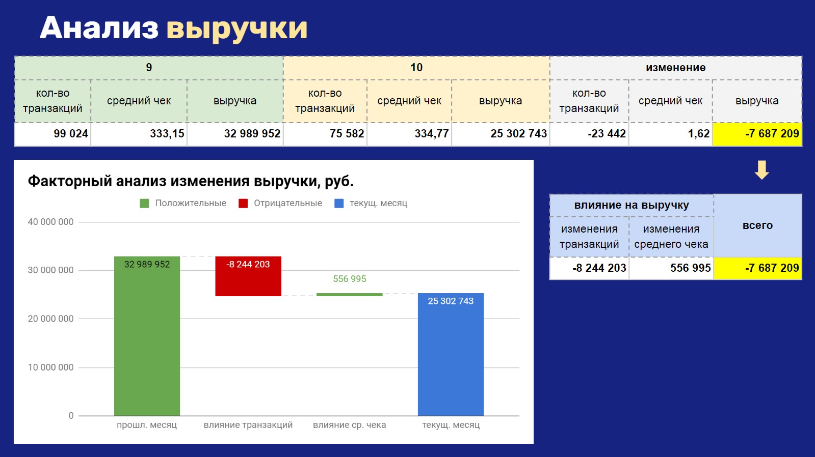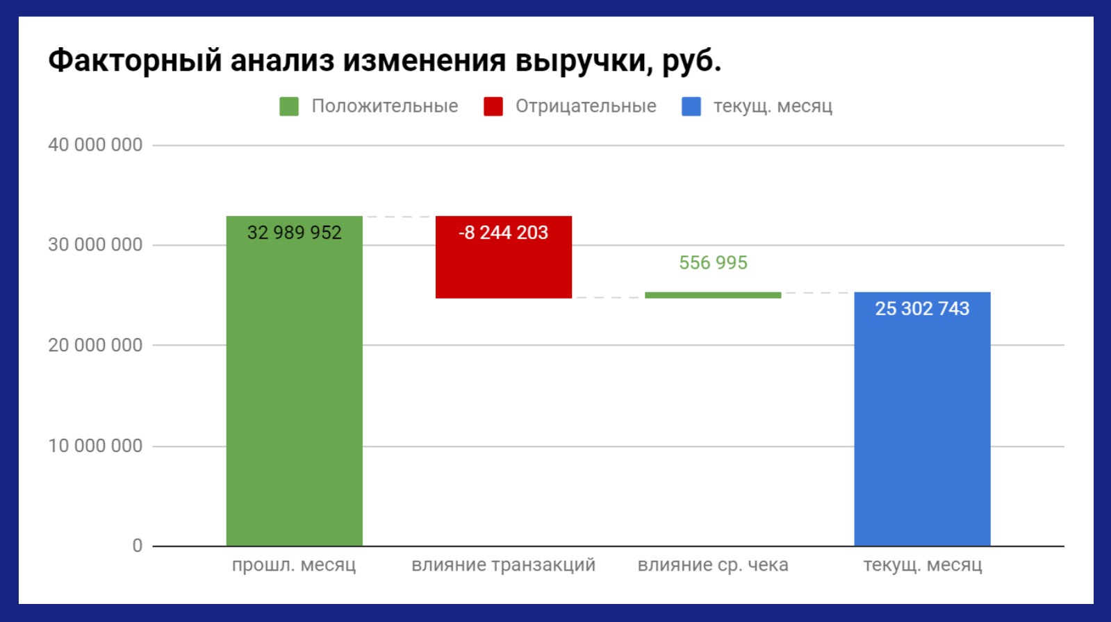 Разберем на примере. В прошлом месяце компания заработала почти 33 млн, а в текущем — 25,3 млн рублей. Получается, выручка уменьшилась на 7,7 млн руб. Но за счет чего?