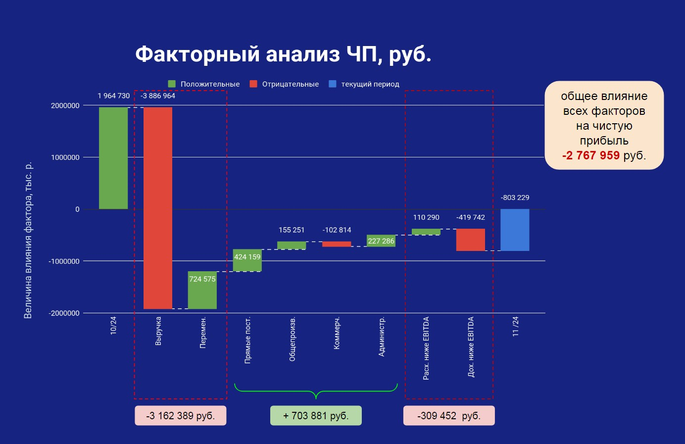 На графике показан факторный анализ чистой прибыли. Благодаря такой визуализации становится понятно, в какой мере те или иные причины привели к общему результату
