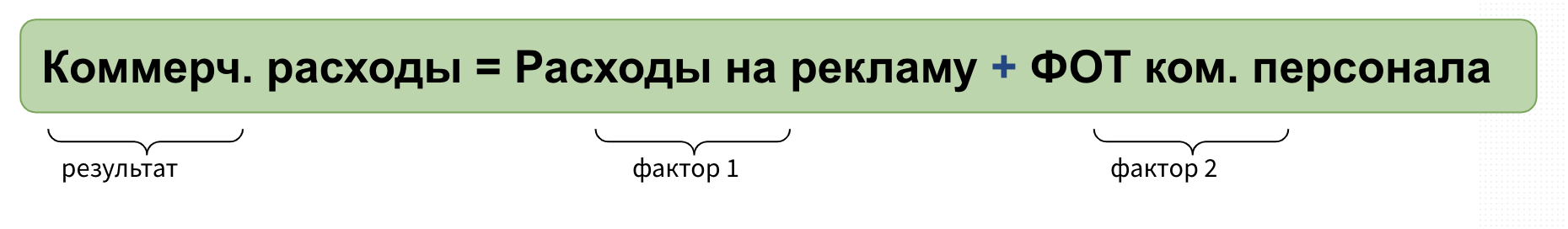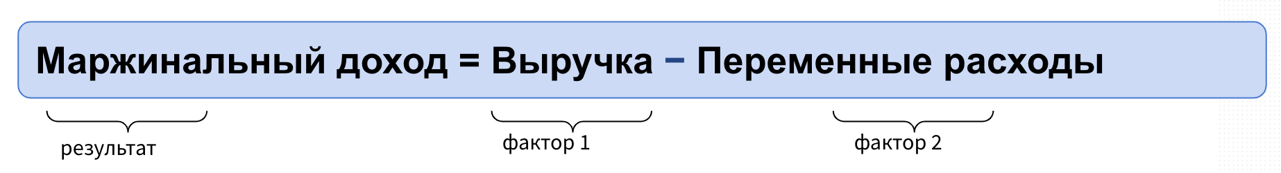Аддитивные модели используют в алгебраических формулах плюсы и минусы. К примеру, расчет маржинального дохода можно выполнить по такой формуле: