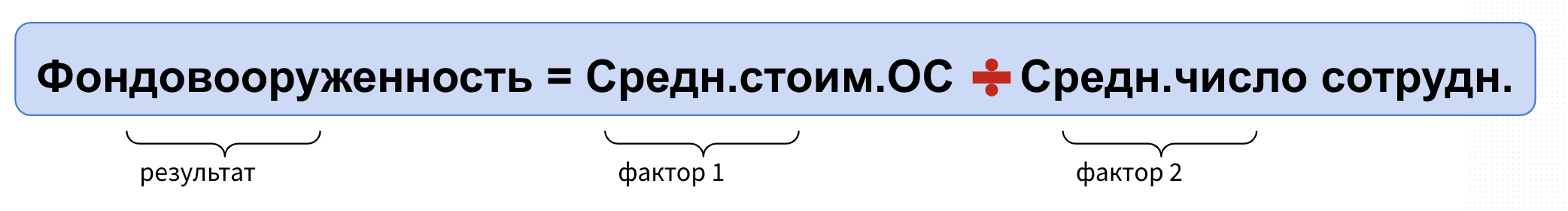 Кратные модели используют в алгебраической формуле принцип деления. Так, фондовооруженность можно рассчитать как отношение среднегодовой стоимости основных средств к средней численности сотрудников: