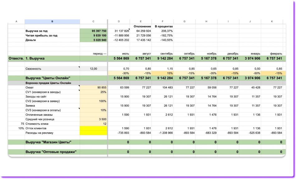 Вот как выглядит готовая финмодель цветочного магазина ↓