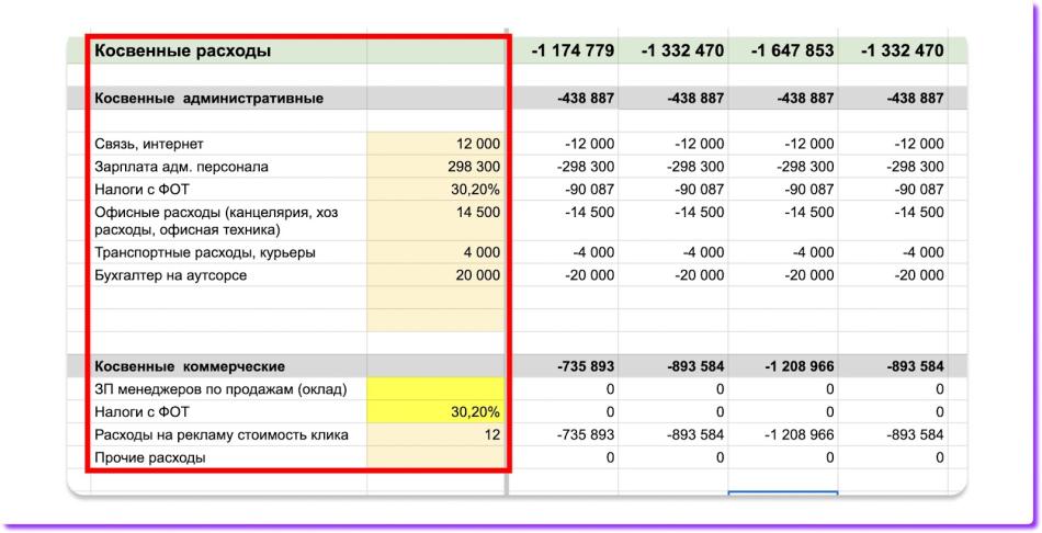 Есть три вида расходов: переменные, общепроизводственные и косвенные. Для каждого из них в финмодели есть свой блок.