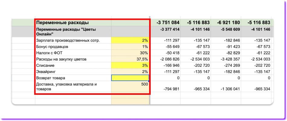 Вместе с шаблоном на почту придут инструкция и варианты таблиц из разных сфер. Финмодель цветочного магазина находится во вкладке таблицы «Другие примеры».