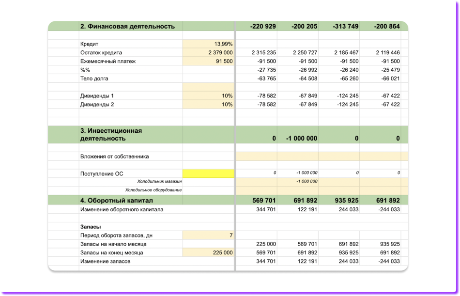 - Инвестиционная деятельность — деньги, которые собственник вкладывает в бизнес сейчас, чтобы увеличить выручку в будущем. Например, покупает оборудование, недвижимость, занимается модернизацией производственных мощностей. В нашу финмодель мы добавили покупку холодильной витрины за 1 000 000 ₽.