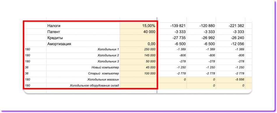 Шаг 4. Добавить налоги, кредиты и амортизацию оборудования