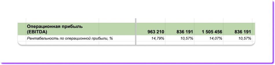 После заполнения блоков в финмодели можно посмотреть на операционную прибыль, которая называется EBITDA. Она показывает эффективность бизнеса до уплаты налогов, кредитов и амортизации. Расчет EBITDA происходит автоматически — в документе есть формула, которая вычитает косвенные расходы из валовой прибыли ↓