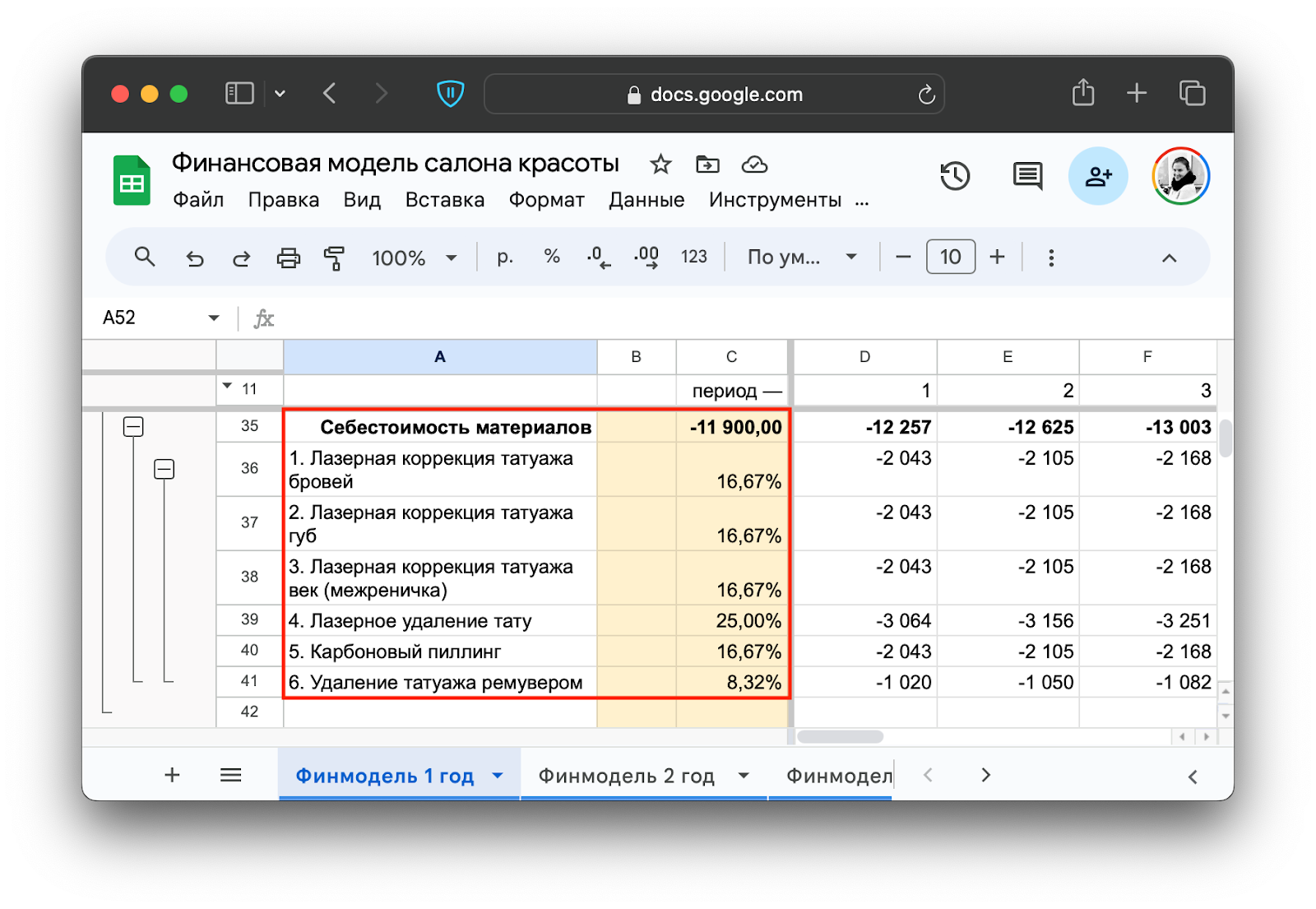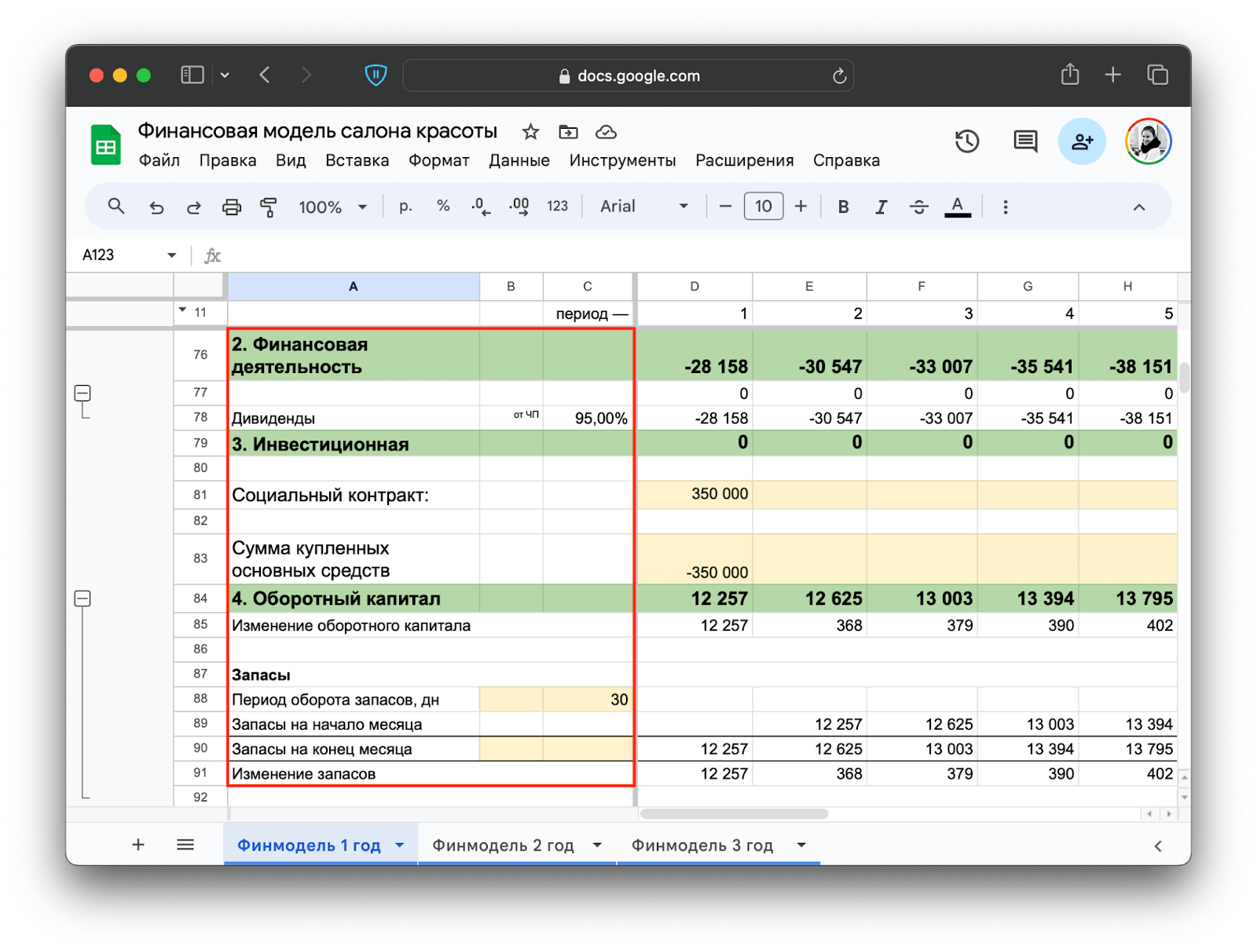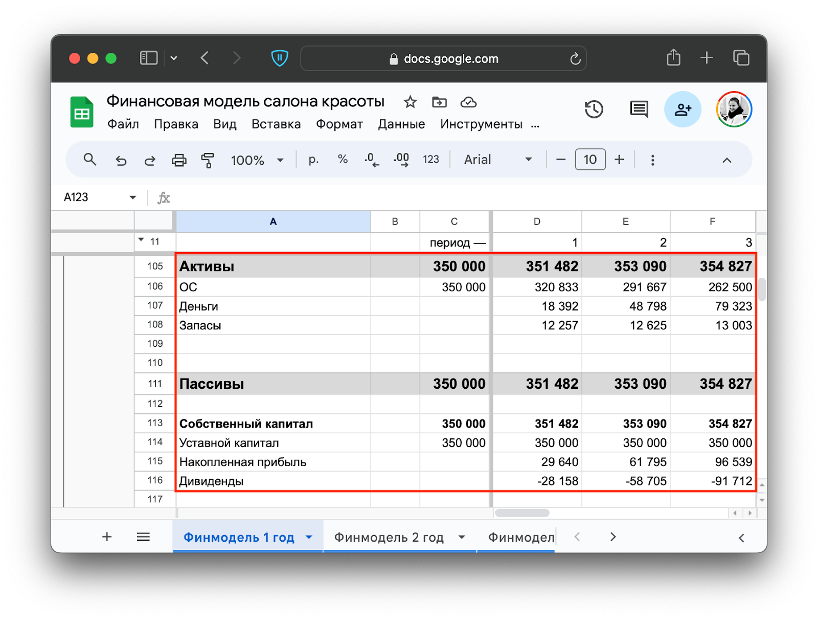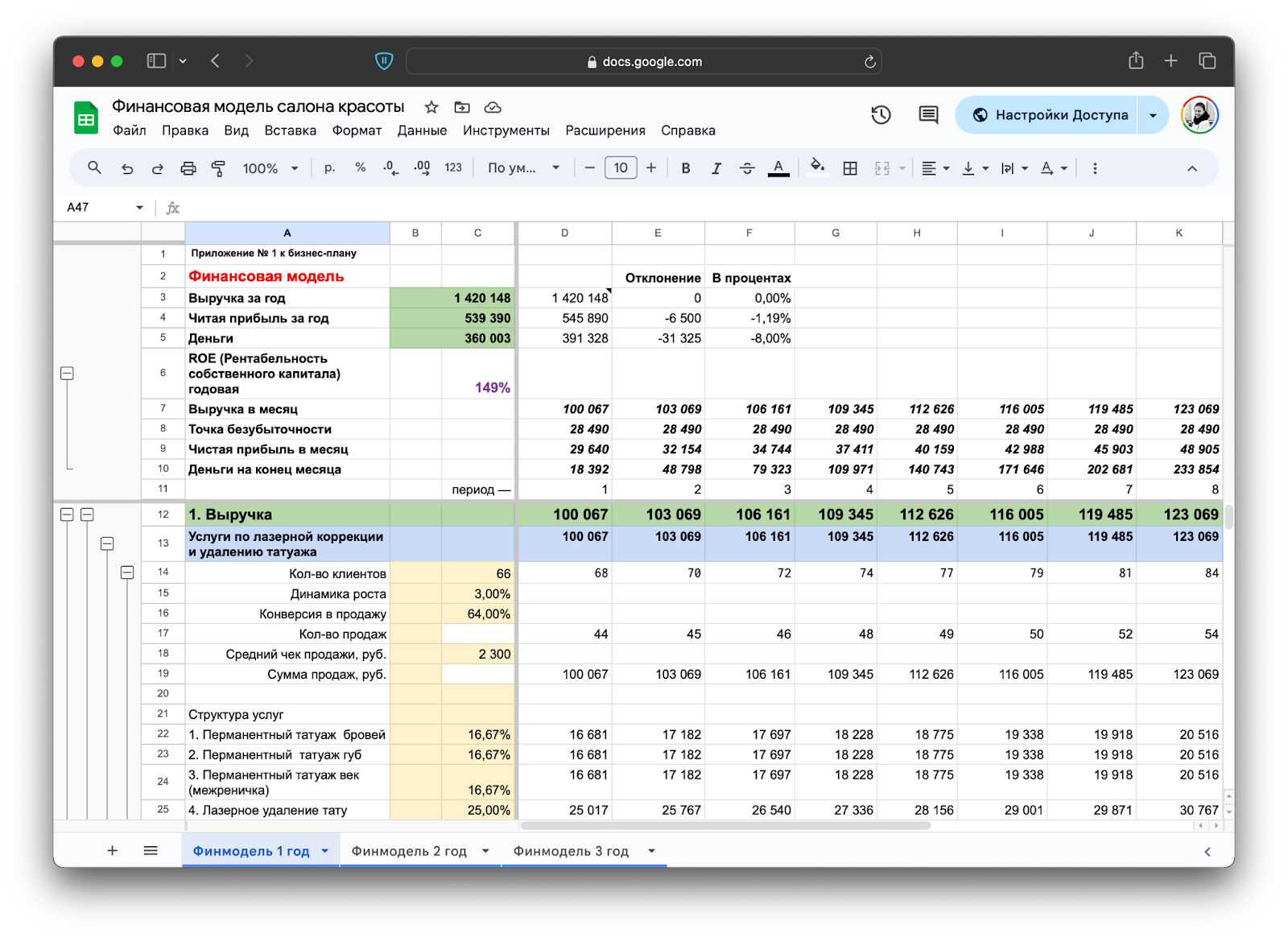 Если пройти все шаги, то получится полноценная финансовая модель салона красоты ↓