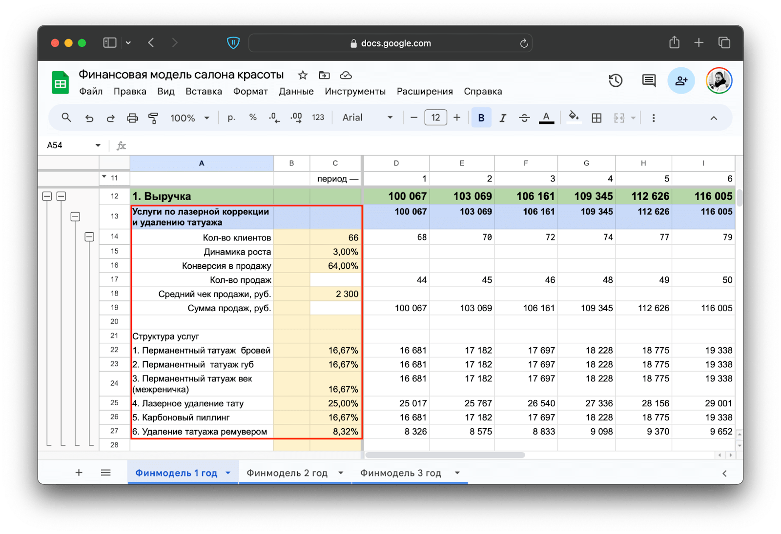 Дальше по шагам разберем, как составить финмодель салона красоты.