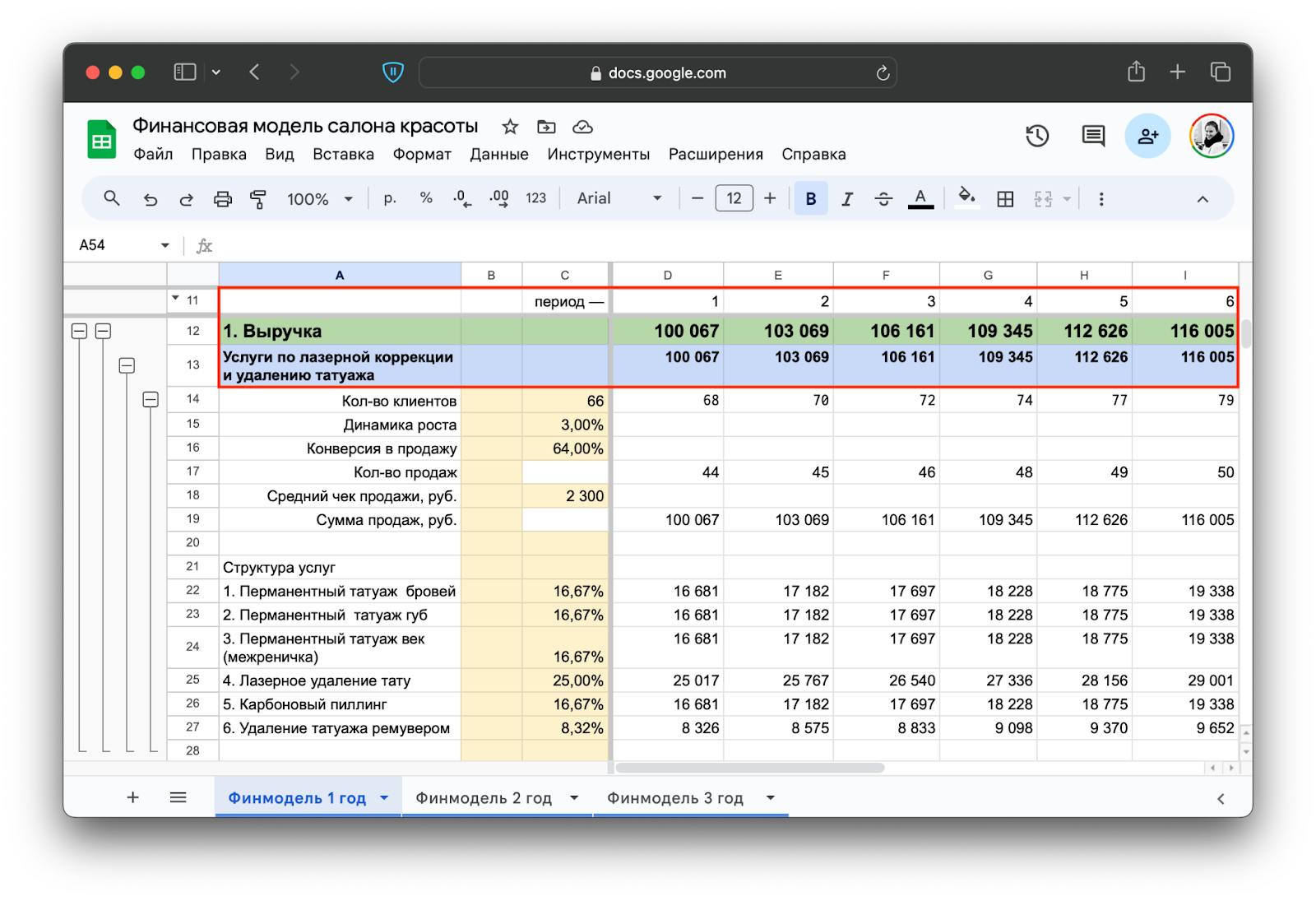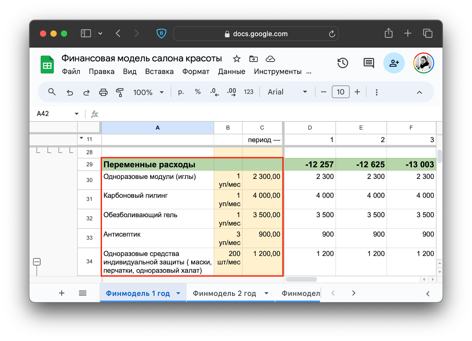 Для финансовой модели салона красоты понадобится эксель- или гугл-таблица с нужными графами, блоками и формулами. Советуем скачать наш бесплатный шаблон, сделать себе копию и возвращаться обратно в статью, чтобы по ходу заполнять свой файл ↓