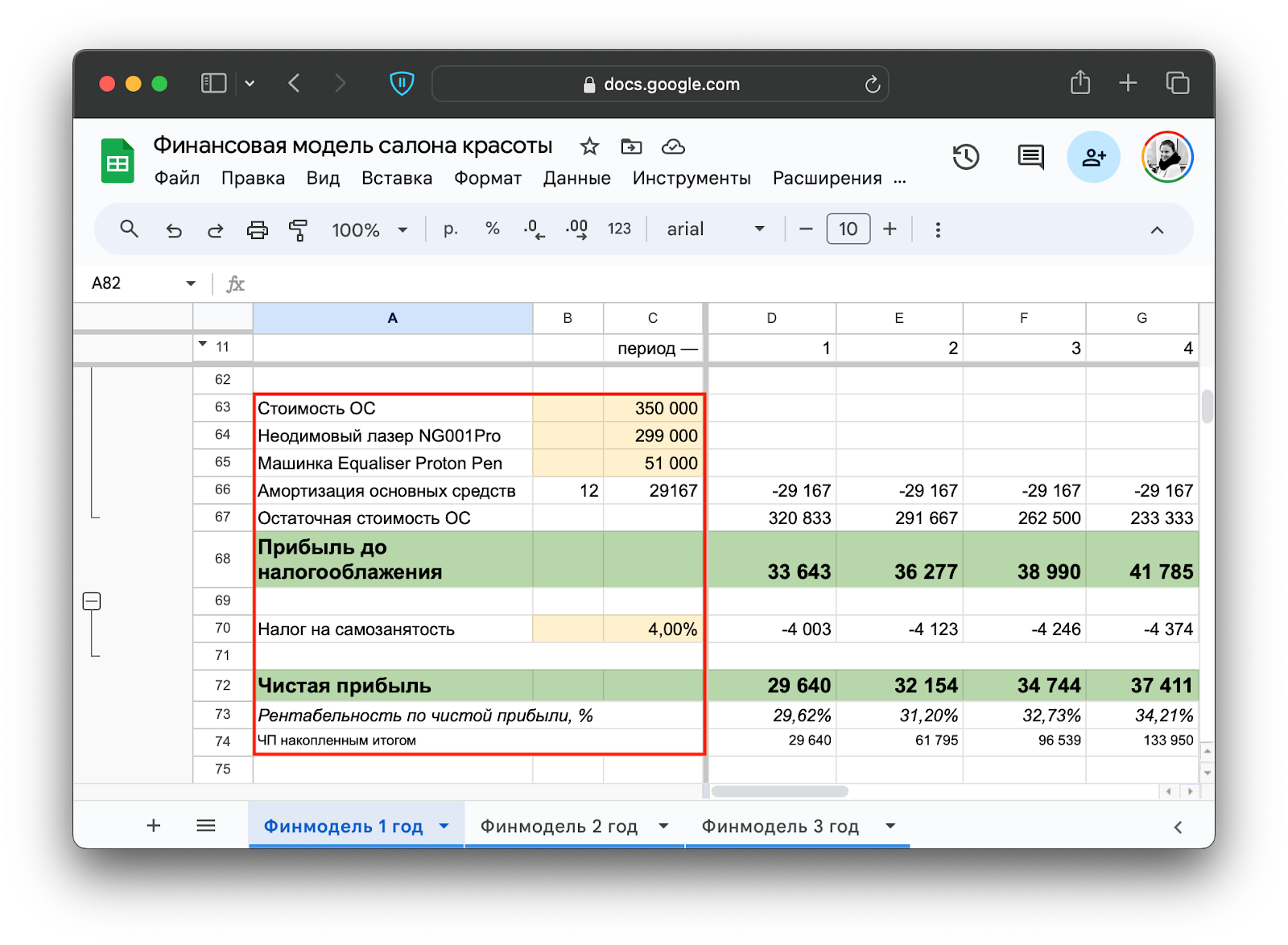 Чтобы узнать чистую прибыль салона красоты, остается внести в финмодель данные о налогах, кредитах и амортизации оборудования.