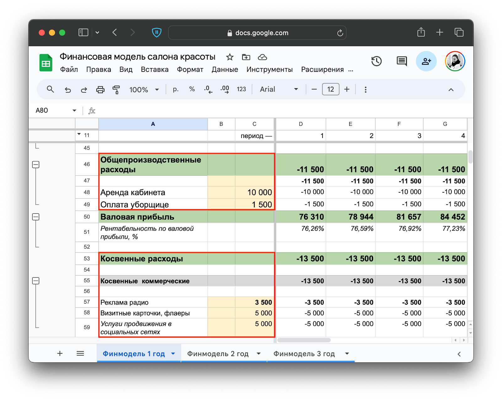 В финмодели салона красоты из нашего примера общепроизводственные и косвенные расходы выглядят так: