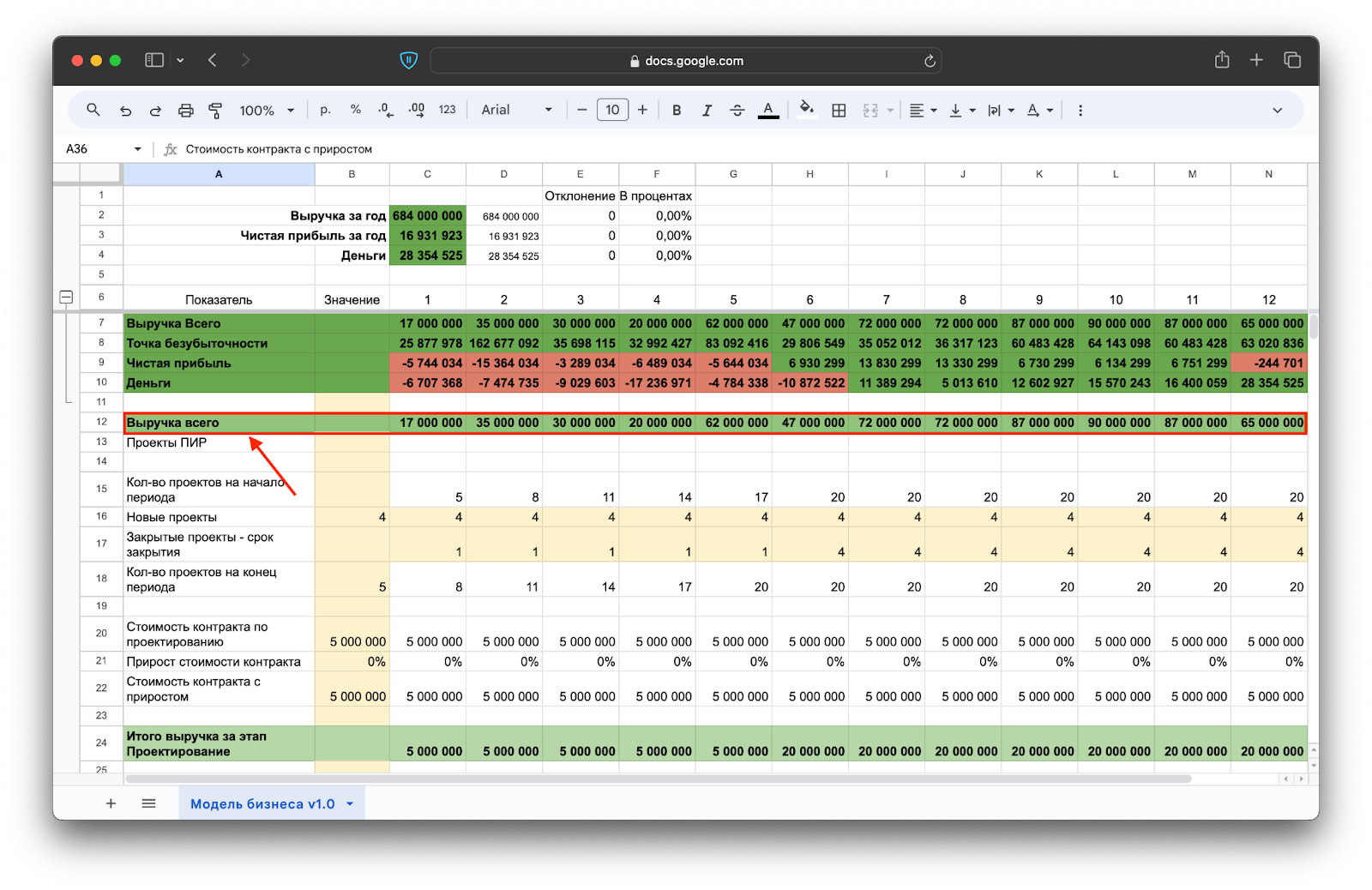 Итоговая выручка по месяцам и этапам собирается наверху таблицы: