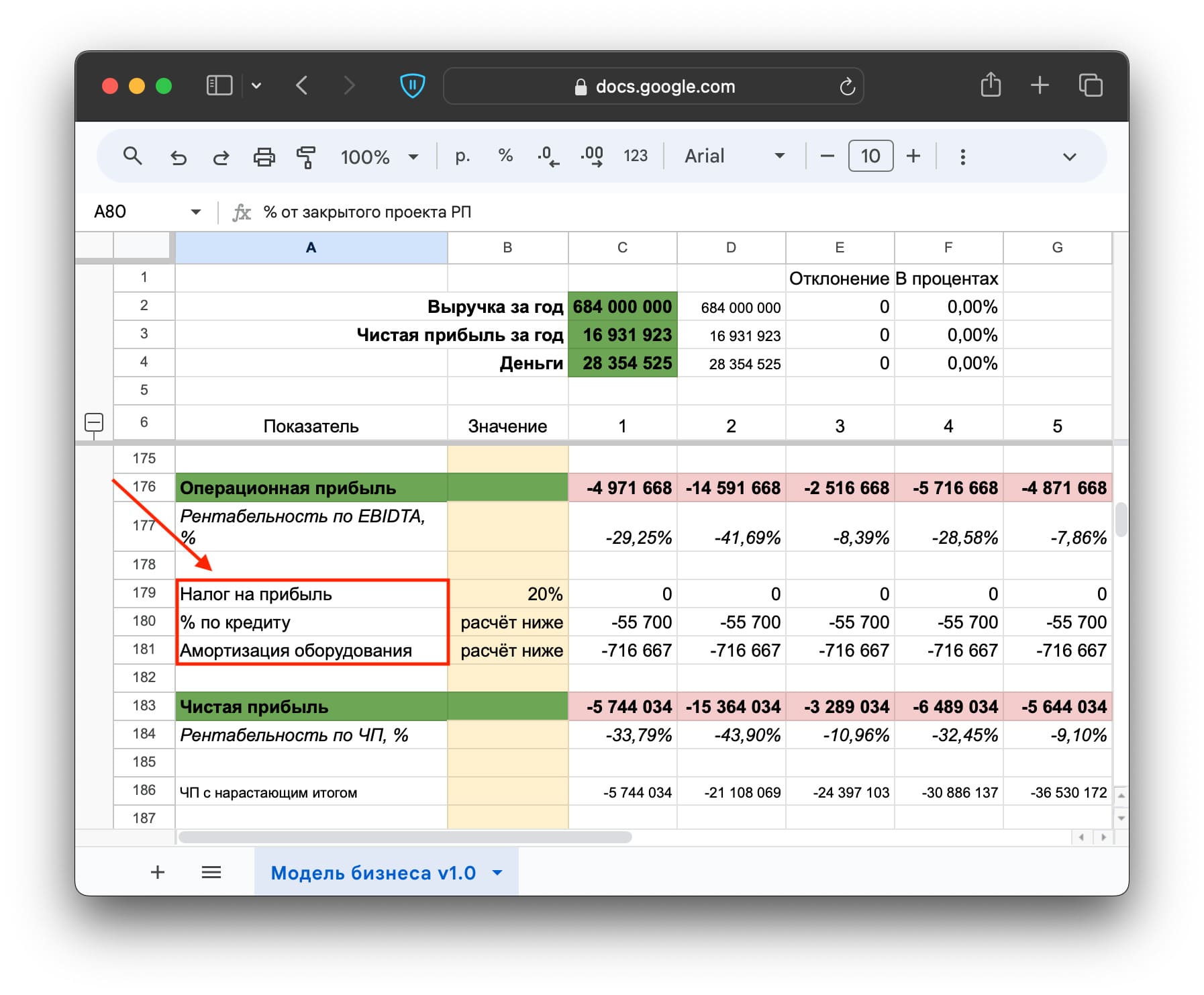 В финале — чистая прибыль. Но чтобы ее посчитать, понадобится внести данные о налогах, кредитах и амортизации ↓