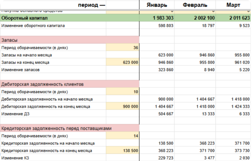 В модели блок оборотного капитала важен для прогноза денежного потока и предотвращения кассового разрыва.
