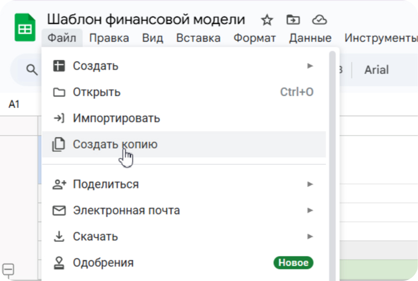 Шаг 1. Копируем шаблон финансовой модели, чтобы он сохранился на гугл диск. Таблицу с Google Диска можно адаптировать в Excel. Для этого нужно скачать таблицу с гугл диска в формате Microsoft Excel (.xlsx). Приступаем к заполнению таблицы.