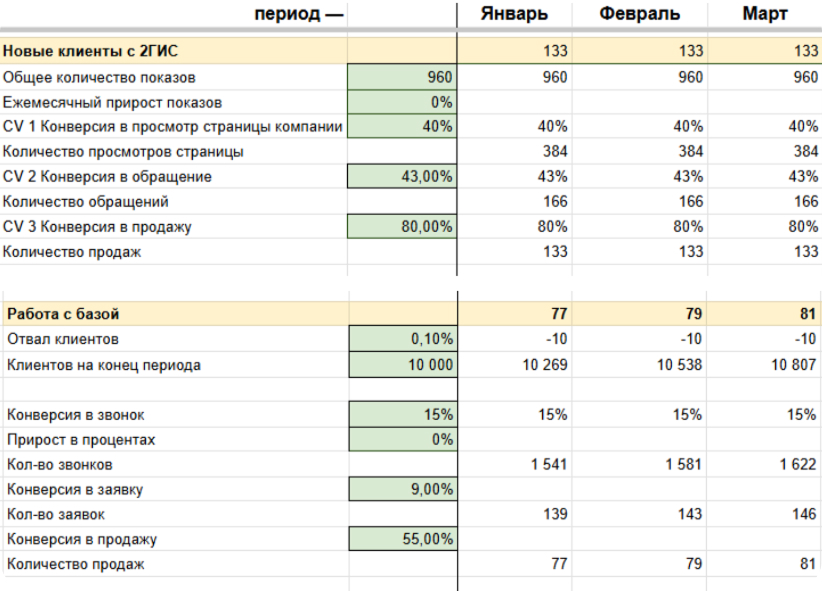 ↑ Воронка продаж с 2GIS и воронка работы с базой постоянных клиентов. В таблице показано, откуда приходят клиенты и на каких этапах они уходят. На каждом шаге считаются переходы: сколько увидели, сколько кликнули, обратились, сделали заказ и купили. Это помогает понять, как эффективно работает реклама и отдел продаж, где теряются клиенты и какие этапы можно усилить