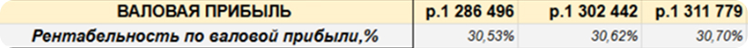 Шаг 6. После сбора общепроизводственных расходов можем оценить валовую прибыль и её рентабельность — от выручки вычитаем переменные и общепроизводственные расходы.