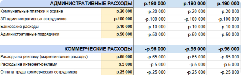 Шаг 5. Идём к постоянным расходам, связанным с поддержанием работы компании. Собираем всё, что есть: аренду, оклады персонала, коммуналку и прочие постоянные расходы.