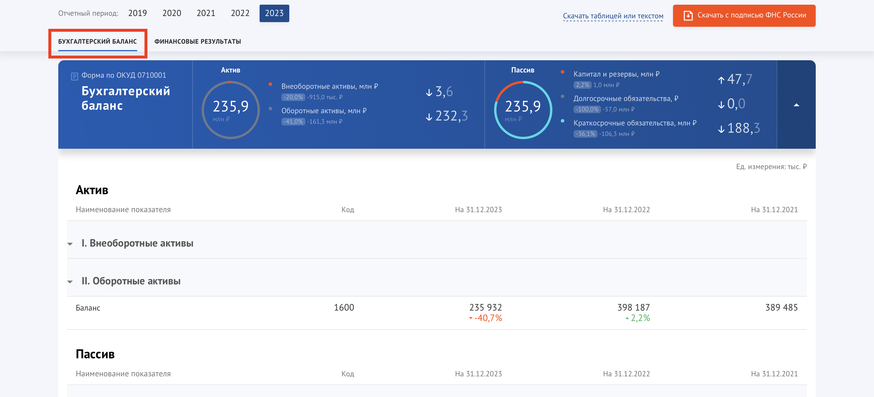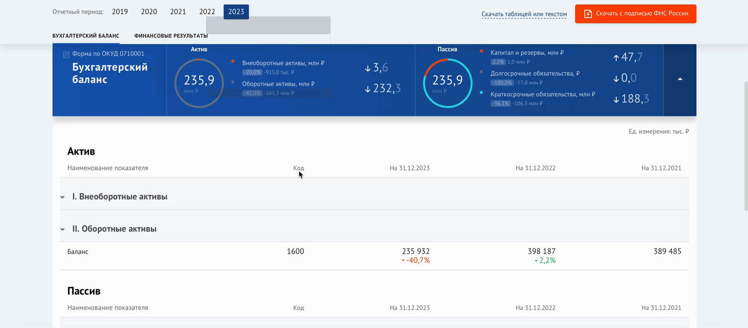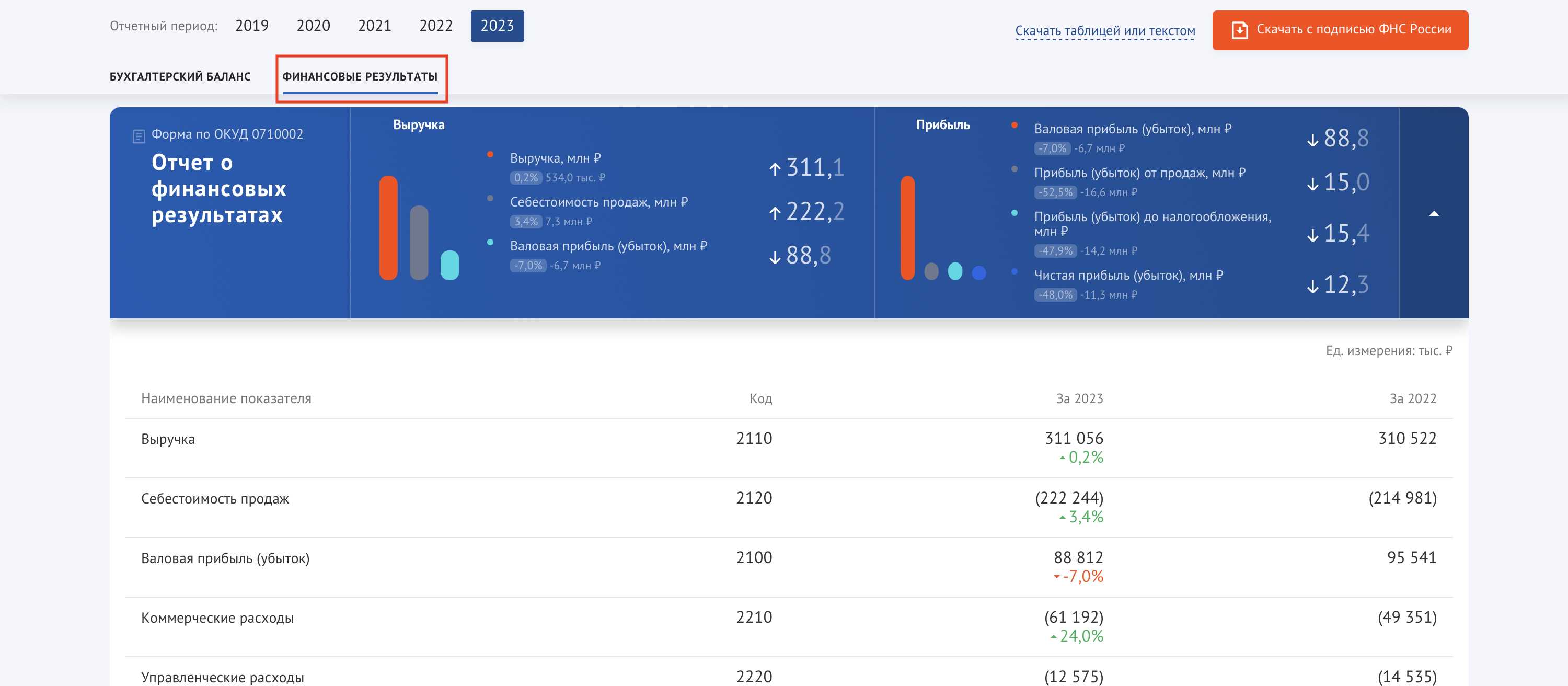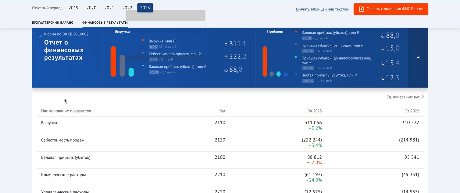 Имейте в виду, что данные будут за прошлый год. Если компания работает давно, вы можете посмотреть, как менялись показатели по годам. Просто переключайтесь между вкладками с годами наверху. Отчётность показывается в динамике сразу за два года, например: 2022 и 2023 или 2021 и 2022.