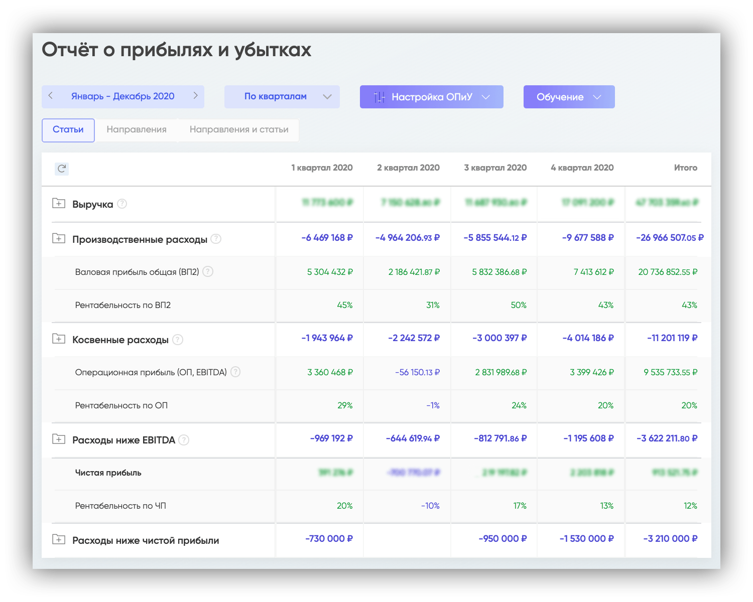 Прибыль. Отчет о прибылях и убытках помогал верно посчитать выручку и прибыль. А еще сразу показывал рентабельность — так мы быстро понимали, насколько эффективно сработала компания в каждый месяц: