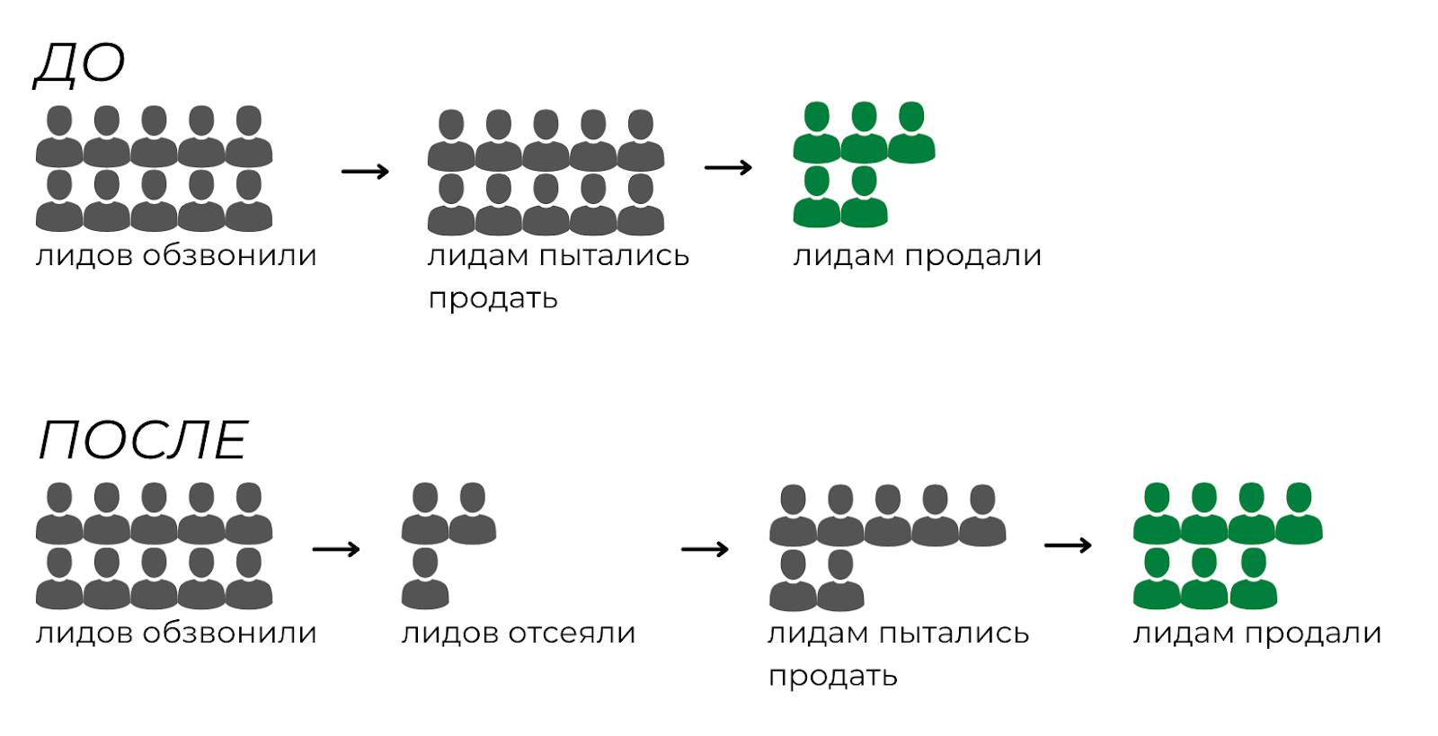 Конверсия выросла из-за того, что менеджеры перестали «впихивать невпихуемое» и смогли перераспределить ресурсы времени так, чтобы не упускать важных клиентов.