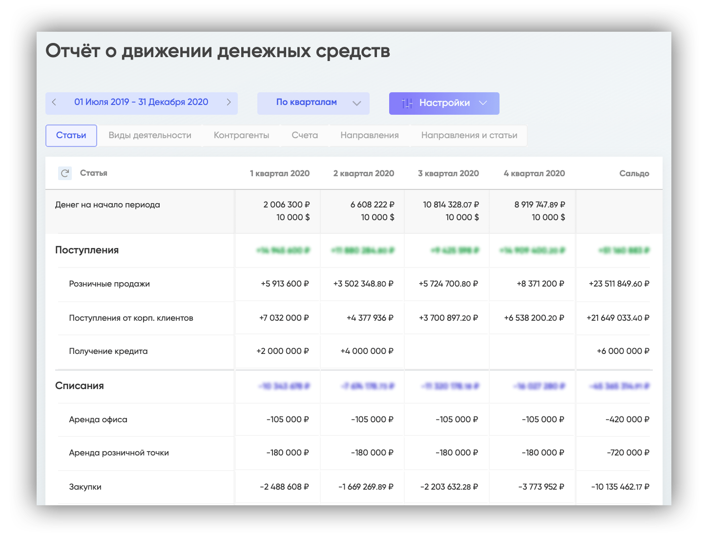 Деньги. По отчету о движении денежных средств мы понимали, откуда в компанию приходят деньги, куда уходят и насколько прибыльно каждое направление: