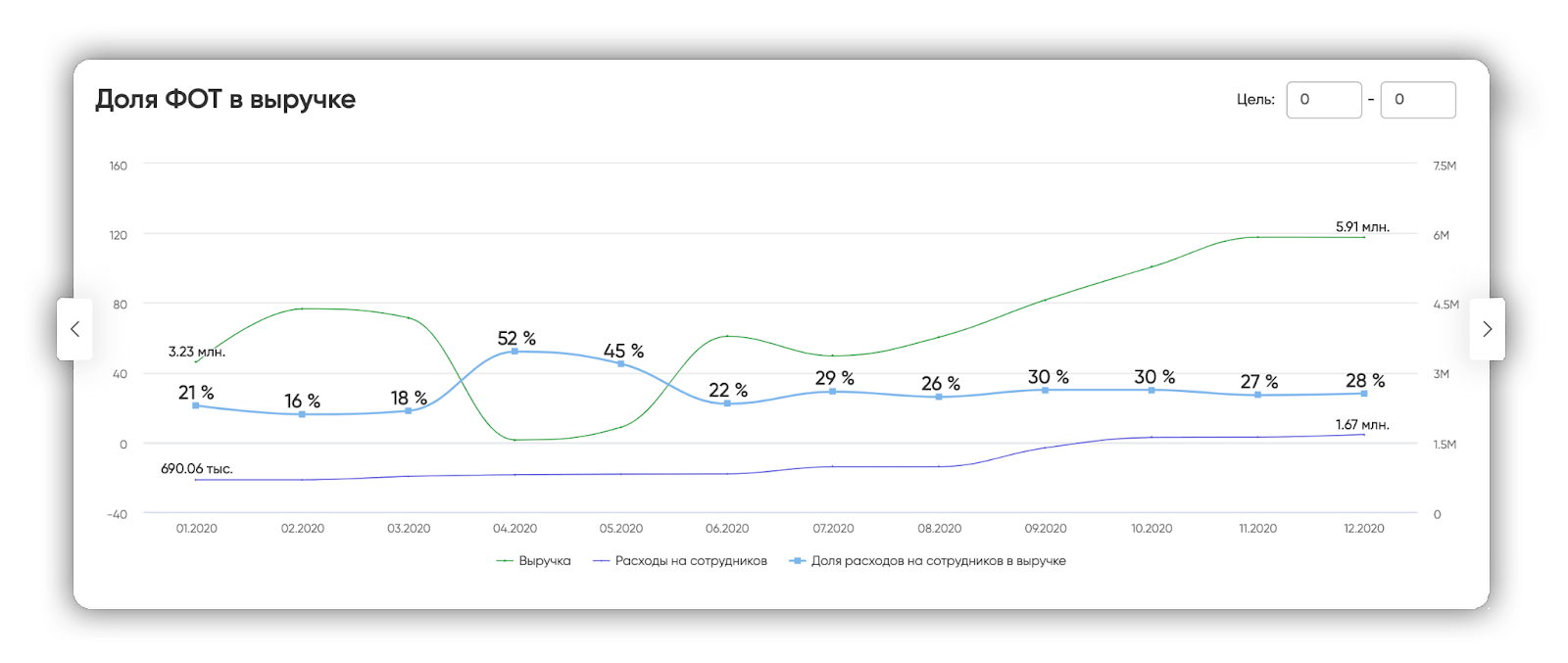 Еще мы наблюдали за долей зарплат в выручке. Тут пригодился график на панели приборов — он показывает, не раздулся ли фонд оплаты труда на фоне выручки.