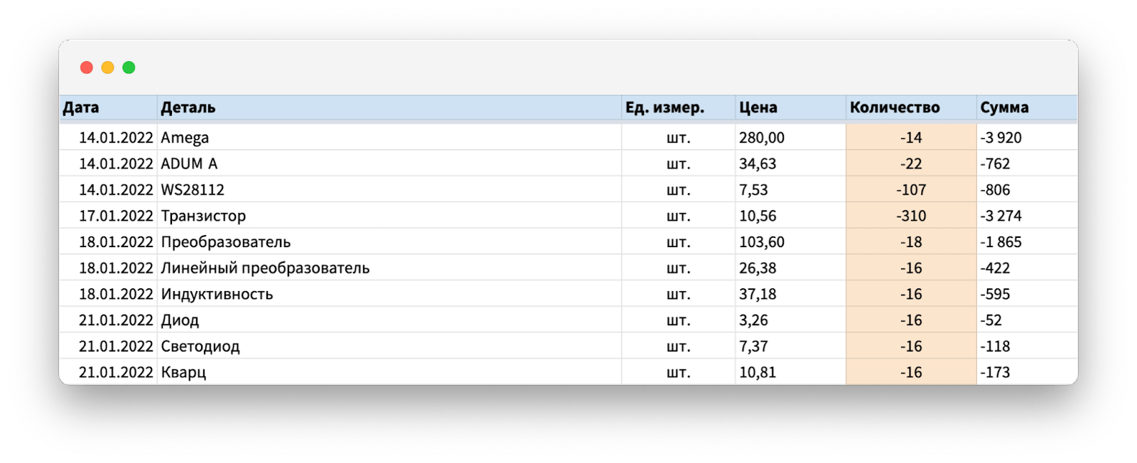 Мы настроили журнал списаний комплектующих — стали следить, сколько деталей купили и использовали: