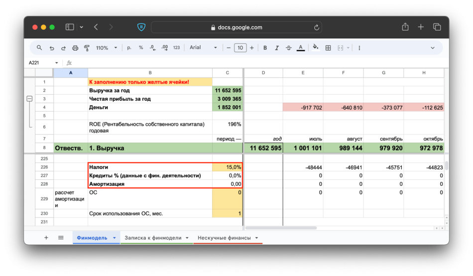 В торговле через интернет оборудования не бывает, и амортизировать нам нечего. А в нашем случае у компании еще и нет кредитов. Поэтому в итоге в финмодель мы вносим только налоги: