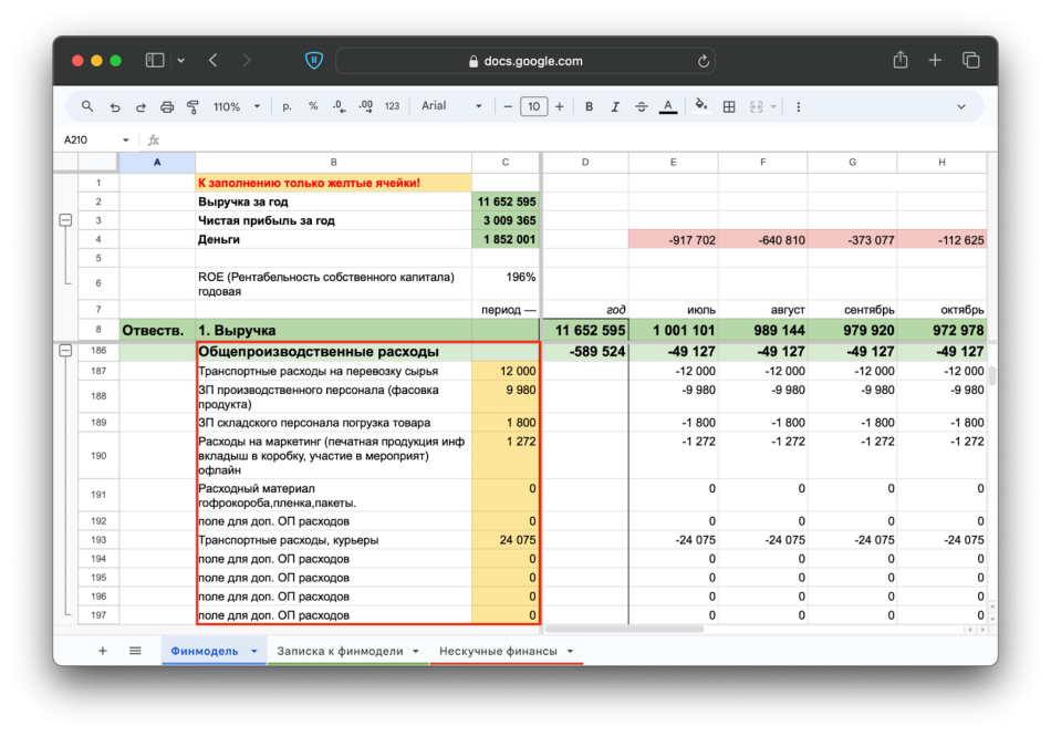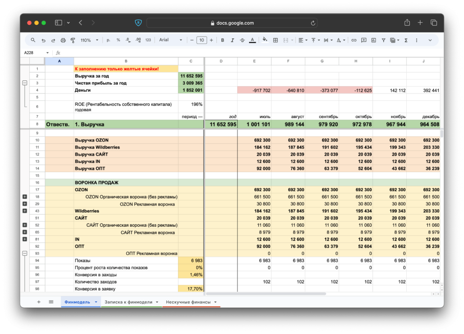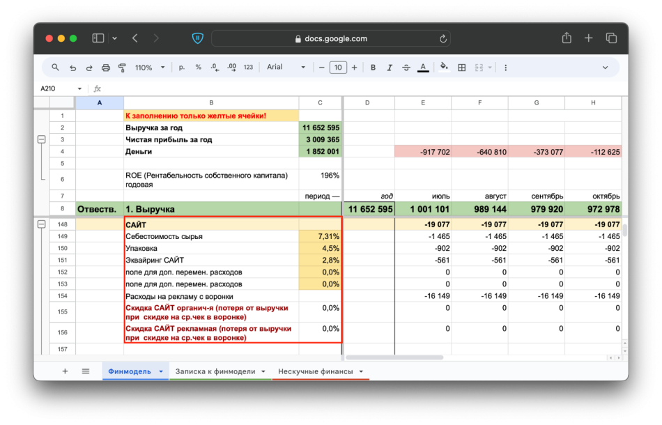 Для финансовой модели интернет-магазина понадобится эксель- или гугл-таблица с нужными графами, блоками и формулами. Советуем скачать наш бесплатный шаблон, сделать себе копию и возвращаться обратно в статью, чтобы по ходу заполнять свой файл ↓