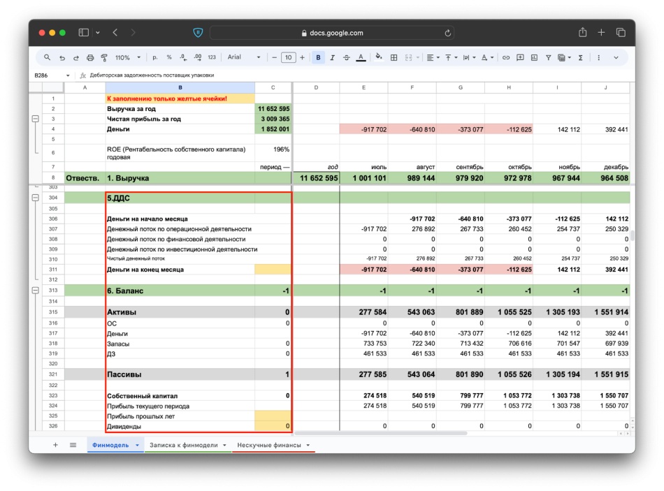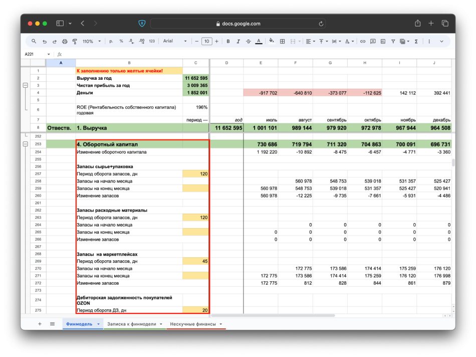 В нашей финмодели финансовой деятельности нет, потому что нет кредитов, а дивиденды не выводятся. Также компания не ведет инвестиционную деятельность, поэтому скриншота тут не будет :—) Но идем дальше.