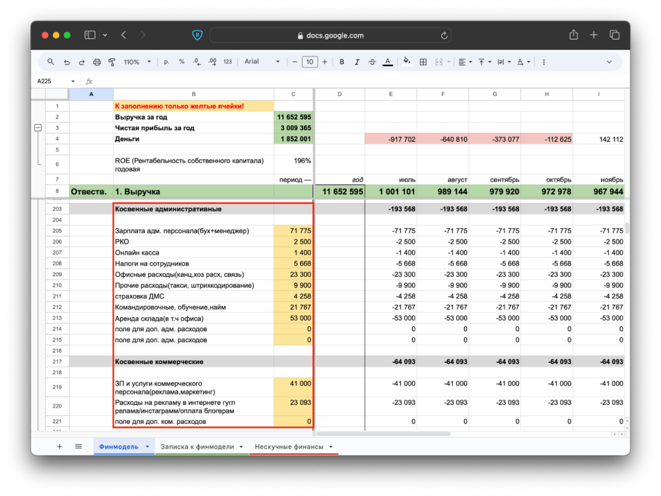 * Нужный вам шаблон лежит во вкладке «Другие примеры» → «Финмодель интернет-магазина»