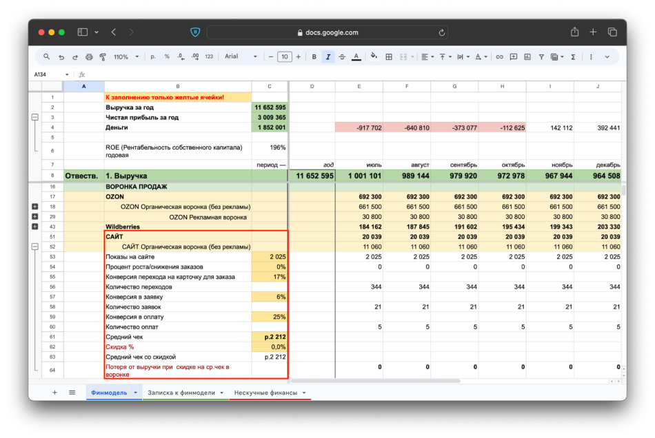 Если пройти все шаги, то получится полноценная финансовая модель интернет-магазина ↓